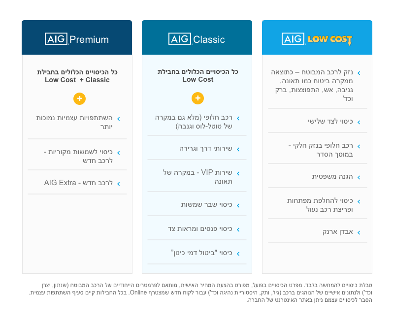 הטכנולוגיה המתקדמת מאפשרת לנו לקבל תמונת מצב עדכנית של השוק ושל מאפייני צריכה ולתת מענה דיגיטלי מהיר. שלוש החבילות מותאמות לממצאים על מאפיינים של צריכת ביטוח מקיף לרכב. בפועל, זה דומה בכל העולם והיום אפשר לאבחן את זה ולעצב את הפתרונות בהתאם. העיקרון המנחה של AIG Low Cost הוא האפשרויות לבחירה מהירה: כל לקוח יכול לבחור את החבילה שמתאימה לצרכים שלו ולתקציב שלו, מבלי להתפשר על העיקר - ביטוח זול לרכב עם כיסוי ביטוחי איכותי ושירות מעולה לטיפול בתביעות - וגם האפשרות לסגור את נושא ביטוח הרכב במהירות ובנוחות. קדימה, תניעו: לבחירת חבילה וקבלת הצעה