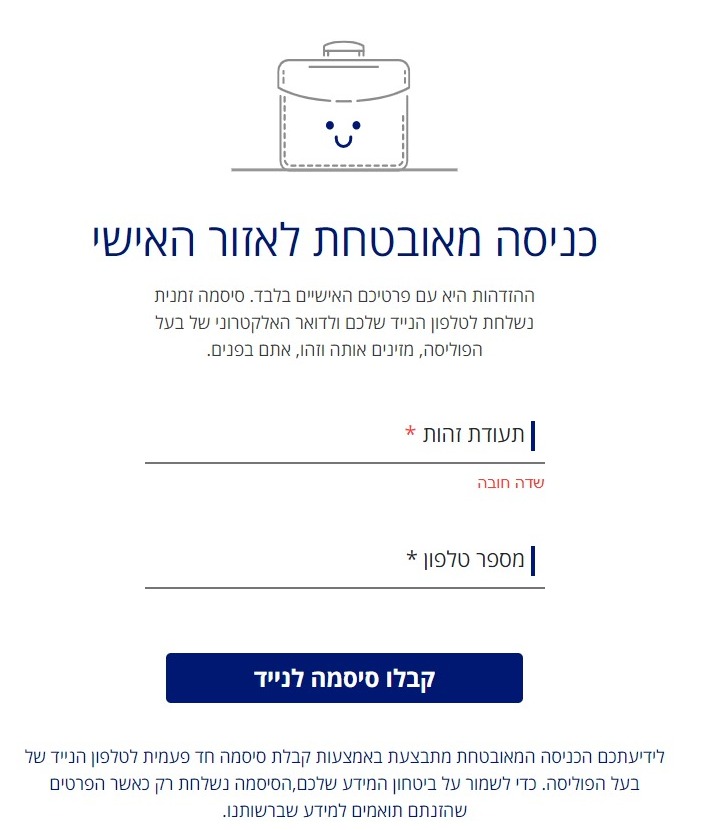 האזור האישי שלכם ב-AIG פועל בטכנולוגיות מתקדמות. כדי להתחבר אין צורך לזכור שם משתמש וסיסמא. מקלידים מספר תעודת זהות ומספר טלפון נייד, ומקבלים מייד סיסמא חד-פעמית לטלפון הנייד. קל, פשוט, נוח, מהיר ובטוח.